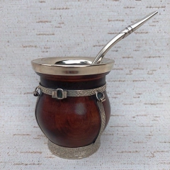 Set de Mate de algarrobo camionero panzón recto. Virola, fleje y sunchos en alpaca. Soldaduras en plata. Bombilla de Alpaca "Pico de Rey"